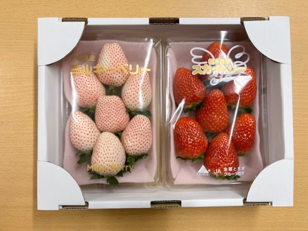 白くて甘い希少なミルキーベリーと、フレーズがオススメする赤いちご(スカイベリーまたはとちあいか)でお届けします。