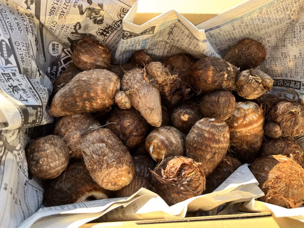 なるべく長く保存ができるように土付き、多少の根っこ付きで子芋、孫芋はなるべく切り離さない掘り立てに近い状態でのお届けになります。