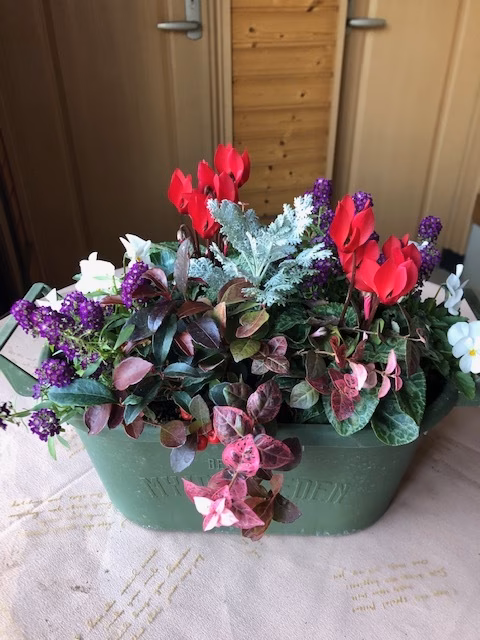 ガーデンシクラメン(スカーレッド系)アリッサム、ハツユキカズラ、チェッカーベリー ビオラ等、バランス良く植え込み、見応えたっぷりです。カラーリーフとの相性もばっちりです。