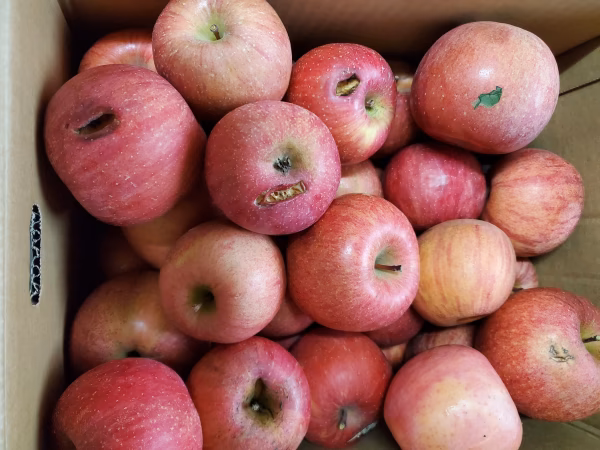 写真のように傷み部分があるサンふじなので傷み部分をとって生食でも料理にもいいと思います。