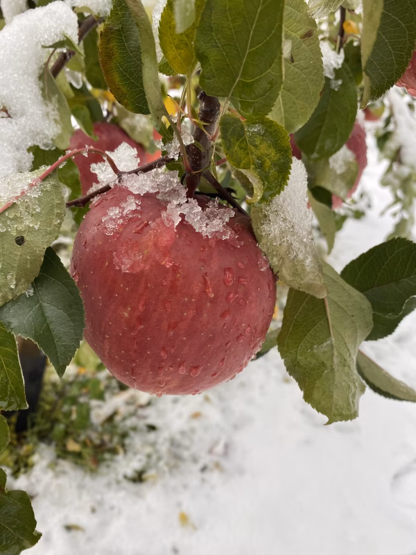 数年前の12月雪の積もる中、園地の冬支度をしていると、樹上に収穫し忘れた1個のりんご、もいで食べてみると、実の締まり具合、味の濃さ、密入りの多さ、糖度、余りのうまさに驚きました😍是非食べてもらいたいりんご🤲