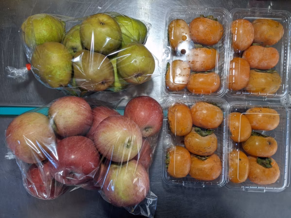りんごはふじりんごですが、小サイズで糖度は11〜12度程度です。ラ・フランスは規格外の小サイズで糖度は14度程度です。柿は完熟したもので糖度は14度程度です。