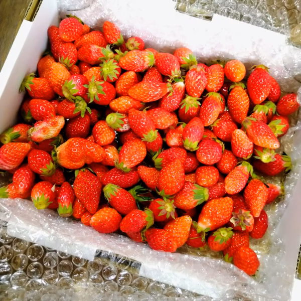 こちらはご家庭用、加工用に最適なお得なパックなし、小粒規格外いちごのばら詰め簡易包装商品です。パック、ラップフィルム除いてありますため、箱にはいちごをギュッとお詰めして、1箱60サイズでお送りできますので、送料をお安くお届けできます。