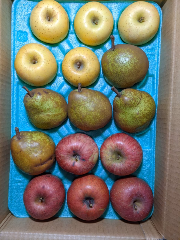 リンゴははるか5玉、ふじ5玉です。ラ・フランスは追熟中ですので、お好みの柔らかさでお召し上がり下さい。