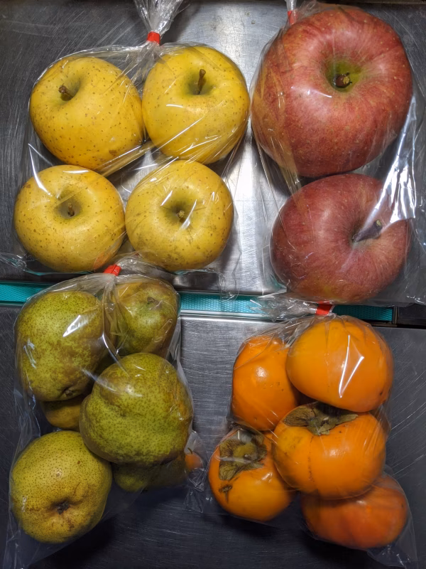柿6個、リンゴ黄色4個、リンゴ赤2個、ラ・フランス6個をそれぞれ1kg前後になるように袋詰めしております。