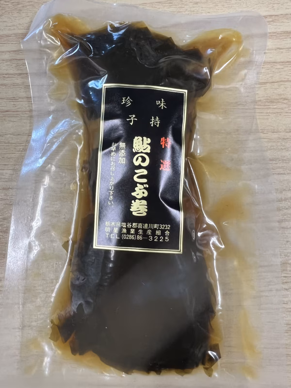 名称    鮎昆布巻 原材料名  あゆ(栃木県産)昆布(日高昆布)かんぴょう       (栃木県産)砂糖 醤油 酒(一部に小麦を含む) 製造者   栃木県さくら市喜連川3232 明星漁業生産組合 栄養成分表示(100gあたり) 鮎昆布巻き エネルギー   152kcal たんぱく質   8.3g 脂質      5.2g 炭水化物    18.1g 食塩相当量   0.81g ※推定値
