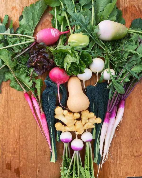 生姜・大根・カーボロネロ・春菊・ネギ・ビーツ・壬生菜・小松菜・人参・かぶ・かぼちゃ・さつまいも・菜の花・レタス・トレビス・コールラビ・カリフラワー・フェンネル・イタリアンパセリ・ディルなど