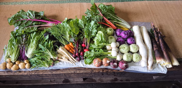 菜花、小松菜、水菜、ホウレン草、玉ねぎ、じゃがいも、絹さや、スナップえんどう、かぶ、いんげん豆、ズッキーニ、ラディッシュ、ブロッコリー、キャベツ、大根、スイスチャード、レタス、山菜(うど)など