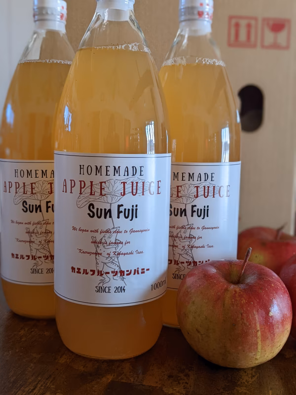 「葉とらずサンふじのジュース」 名称 りんごジュース(ストレート) 原材料 小布施産りんご  内容量 1000ml 保存方法 直射日光を避け常温で保存 販売者 カエルフルーツカンパニー      長野県上高井郡小布施町 製造者 株式会社 もりだくさん     長野県飯田市川路7638−2 賞味期限 2027.12.31