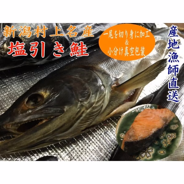 新潟県村上市名産『塩引き鮭』を産地漁師が製造直販。 原材料は村上市寝屋漁港の定置網で獲れる『秋鮭』と『塩』のみ。 漁師の目利きで厳選した秋鮭を、村上市伝統の製法で手間と時間をかけて仕込み、地域特有の真冬の寒風で鮭を干しあげて旨味を熟成させました。 鮭の町の本場の味。お歳暮などギフト用にも大変喜ばれます。 ※生目方とは加工前の生の状態ではかった際の重量の事です。出来上がりの製品は生目方の半分程の重量です。