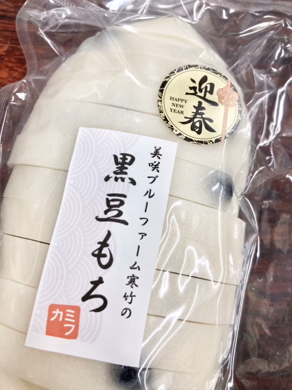 当園栽培の2種類の餅米【岡山県産ヒメノモチ】と【岡山県産ヒヨクモチ】をブレンドし、岡山県産の黒豆を使って、杵つきした塩味の豆餅です。
