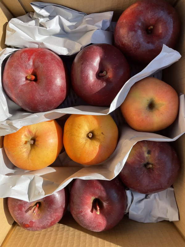 希少品種が成り始めましたので出品させていただきます。 蜜少、キズ等ありますのでご家庭用としてお求め下さい。 こうみつ・・・スターキングデリシャス×紅玉の組み合わせでできたりんごです。蜜入りが良く食べると黒糖のような風味がします🍎 1週間程、常温保存で追熟させますとミルキーな味わいが感じられますので2度楽しんでいただけたらなと思います。 6〜8玉 ムーンルージュ・・・いろどり×ふじの掛け合わせで果肉が赤く、酸味と甘みのバランスが絶妙です。 軸サビが出やすいのも特徴です。 2~4玉 内容量は3kg箱8〜12玉入りとなっております。 ※時期が限られている為、お受取り日時の指定は指定はできませんので予めご了承ください。
