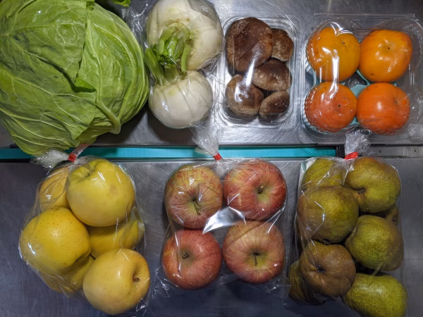 キャベツ1.2kg、カブ700g、シイタケ100g、柿700g、リンゴ2.4kg、ラ・フランス1.7kgの詰め合わせです。