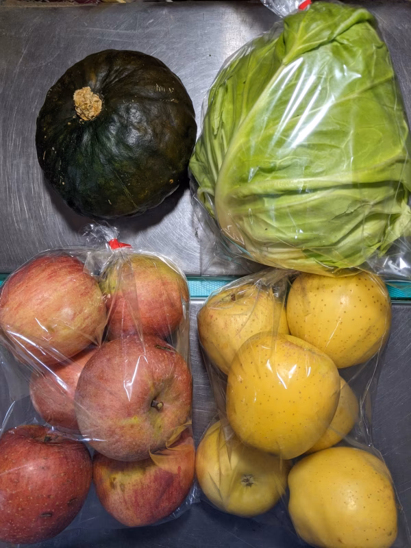キャベツ700g、カボチャ700g、リンゴ2.9kgの詰め合わせです。リンゴははるかとふじです。B級品ですので、価格はリーズナブルに設定しております。