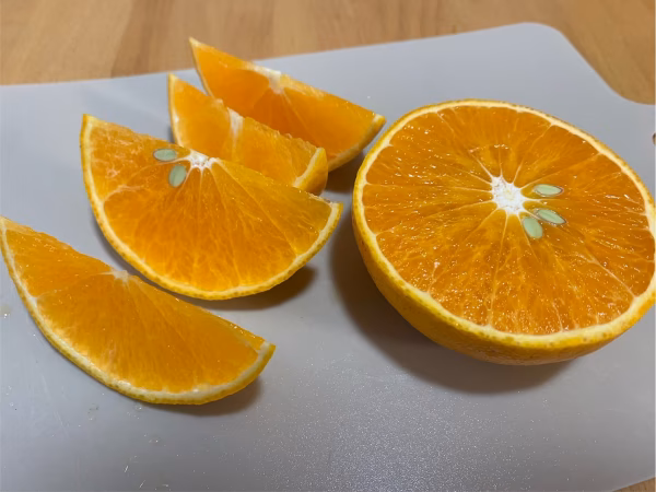 あいか28号は皮が薄く、手で剥きにくいため1枚目の写真のようにスマイルカットして食べるのが一般的です。冷蔵庫で冷やして食べても美味しいです。
