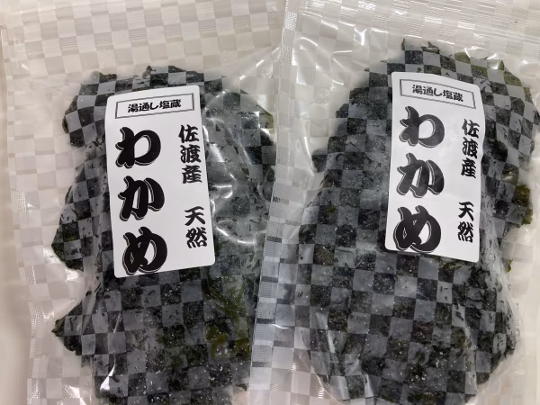 佐渡島の近海は暖流と寒流が入り混じる絶好の漁場として知られており、魚介や海藻類にとっては絶好の生育の場所でもあります。日本海の冬の荒波にもまれた育てられた佐渡産の天然わかめは身が厚く、歯ごたえもあり風味豊かです。  毎年4月上旬から下旬ころにかけて旬を迎える「わかめ漁」で刈り取った新鮮なわかめを一度水洗いして、そのあと沸騰したお湯にサッと湯通します。そのあと水気を切り塩をまぶし、塩もみをするとどんどん水分が出てきますので水分がなくなりしおれたようになるまで水分を出します。そうして出来上がった塩蔵の生わかめを袋詰めしてご提供いたします。  お召し上がりの際には食べる分だけ取り出していただき2~3回程度かけて水洗いして塩分を取り除いてあげればこれまた風味豊かなわかめに早変わり!あとはお好きな大きさにカットしてお味噌汁の具材や麺類のお供にどうぞ。  余った生わかめは冷蔵庫の中で保存しておけば長期保存もできます。