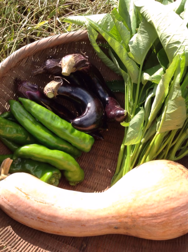 雨でグングン伸びる空芯菜やモロヘイヤ、意外とお終いに近づくこの時期に味がグイっと濃くなる甘とうがらしやナスなどの夏野菜も続いています。