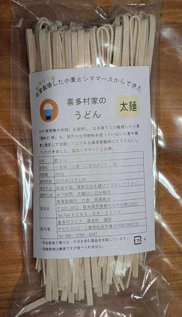 EM(有用微生物群)を活用し、土を育てつつ三重県で栽培した小麦「農林61号」を、農薬や化学肥料を使っていない小麦や蕎麦に限定して製麺しておられる栃木県の黒澤製麺所にてうどんにしていただきました。一般的な小麦粉よりもふすま分を多く含むため、真っ白では無く、食感も少しブツブツしているように感じられます。