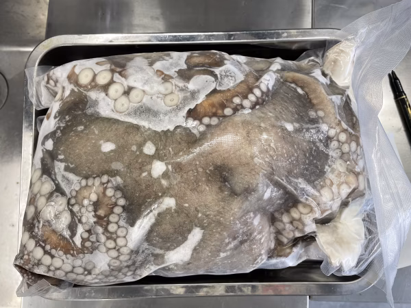 このタコは船の上からモリを撃ち引っかけで漁獲した物または素潜りで取ったものになり傷等があります。