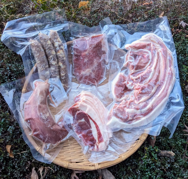小さめ猪のスペアリブとモモ肉、無添加猪ソーセージが入った福「箱」です。