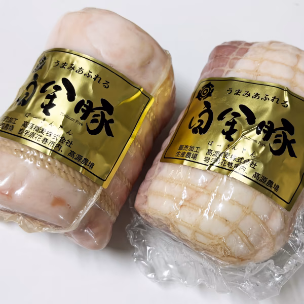 - 白金豚ホワイトロースハム【加熱済】 白金豚ロース肉(岩手県産)、食塩、砂糖、乳たんぱく質/調味料(無機塩等)、ソルビット、酸化防止剤(V.C.)、保存料(ソルビン酸K)、増粘多糖類、発色剤(亜硝酸Na)、(一部に乳成分・豚肉を含む) 熱量 222kcal たんぱく質13.9g 脂質16.8g 炭水化物1.6g 食塩相当量1.8g 白金豚ホワイトももハム【加熱済】 白金豚モモ肉(岩手県産)、食塩、砂糖、乳たんぱく質/調味料(無機塩等)、ソルビット、酸化防止剤(V.C.)、保存料(ソルビン酸K)、増粘多糖類、発色剤(亜硝酸Na)、(一部に乳成分・豚肉を含む) 熱量 178kcal たんぱく質16.1g 脂質5.8g 炭水化物1.6g 食塩相当量1.9g 販売者 高源精麦株式会社 岩手県花巻市大通り1-21-1 製造者 肉の横沢 八幡平市大更21-51-1