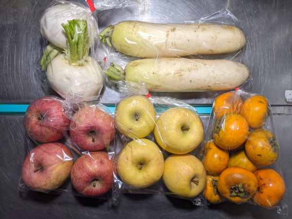 カブ800g、ダイコン1.2kg、柿1.2kg、リンゴ2.3kgの詰め合わせです。柿は平種無しです。リンゴは、はるかとふじです。 売れ残りの商品を詰め合わせしております。キズ等がありますので、価格はリーズナブルに設定しております。