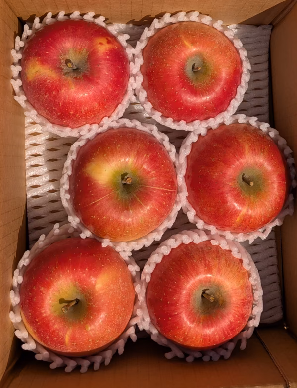 葉とらずサンふじです。 サンふじは無袋で栽培したふじです。 有機肥料で数十年栽培した完熟サンふじを収穫したので香り良く甘みがあります。 ただ当地の昨年の天候は夏の干ばつ後に秋の長雨で果皮の裂果被害となりました。 そのため収穫後も果軸周辺、果皮などに微小の軽いヒビが生じてしまいますので稀にその様なものも入る場合がありますのでご承知おきください。 この事をお含みの上、ご注文をお願いいたします。  今回の梱包は、フルーツキャップとなります。