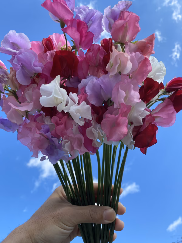スイートピーはとても繊細なお花のため、栽培にあたっては茎折れや病気、害虫がつかないよう管理し、発色と花持ちを良くするために水分を抑えて育て上げます。