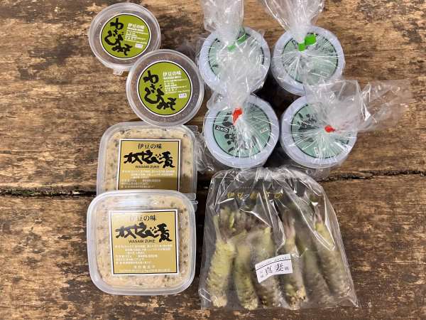 自家製の*わさび漬け *わさび味噌 *茎三杯酢漬け *茎醤油漬け の中から8個お選びください。備考欄に希望の加工品と個数をご記入ください。