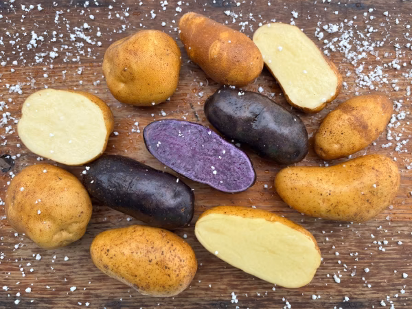 定番メークインとその変異種タワラ小判、天然紫色のシャドークイーン、青森在来おこっぺ(奥戸)の4種類。