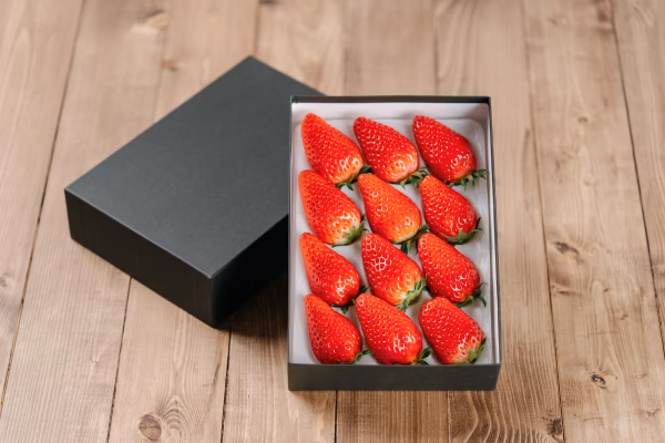 この『章姫』は、酸味を感じさせない甘さが特徴で、幅広い年代のお客様に喜ばれています。手間を惜しまない栽培方法により、色艶、大きさ、そして甘さが抜群の逸品に仕上げました。