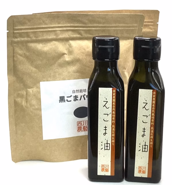 - えごま油 名称: 食用えごま油 原材料名: 食用えごま油 原料原産地名: 鳥取県倉吉市 内容量: 110g 賞味期限: 製造日から6ヶ月 保存方法: 多湿を避け冷暗所で保存してください。 黒ごまパウダー 名称: 黒ごまパウダー(粉末) 原材料名: 黒ごま 原料原産地名: 鳥取県倉吉市 内容量: 150g 賞味期限: 製造日から4ヶ月 保存方法: 直射日光と高温多湿を避け涼しいところで保管 共通 製造者: 西川 真 / 鳥取県倉吉市秋喜350-20