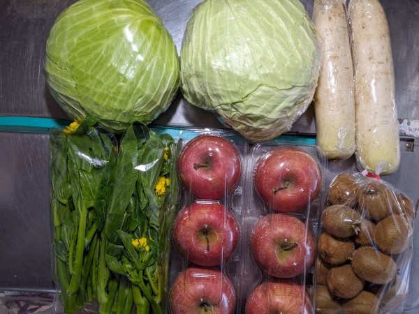 キャベツ2.6kg、ダイコン1.3kg、アスパラ菜500g、リンゴ2.2kg、キウイ1.2kgの詰め合わせです。