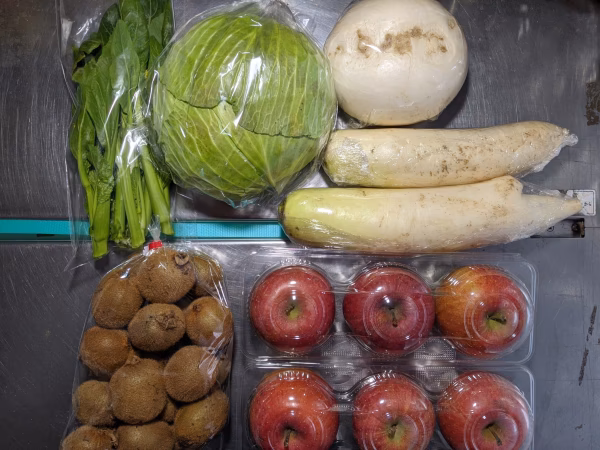 キャベツ900g、カブ900g、ダイコン1.3kg、アスパラ菜150g、リンゴ1.7kg、キウイ1.2kgの詰め合わせです。 リンゴはふじです。キウイは追熟中ですので、お好みの柔らかさでご利用下さい。 なお、複数出品のため、それぞれの重量や形状には差異がございますのでご了承下さい。