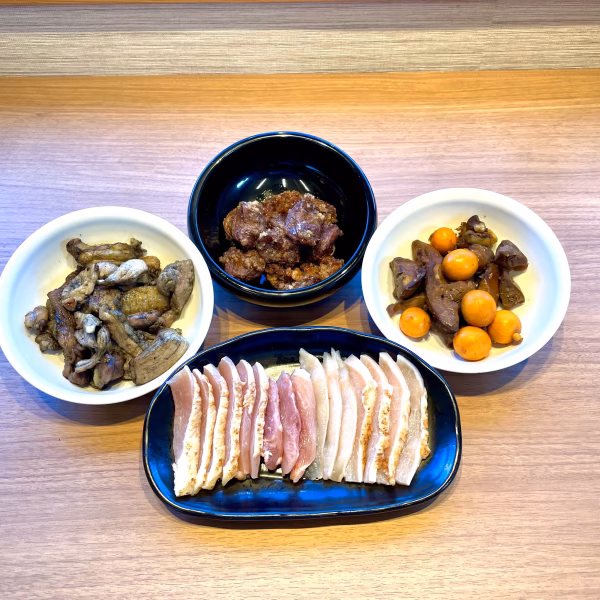 【自家製もつ煮込み】 原材料:鶏もつ(鹿児島県産:レバー、キンカン、砂肝、心臓)、醤油、砂糖、みりん、にんにく、生姜、香辛料(一部に卵・小麦・大豆・鶏肉を含む) 【自家製砂ずり唐揚げ】 原材料名:鶏砂肝(鹿児島県産)、でん粉、たれ(しょうゆ、生姜、清酒、にんにく、かつおだし、砂糖、食塩、香辛料)/調味料(アミノ酸等)、(一部に乳成分・小麦・大豆・鶏肉を含む) 【自家製炭火焼き】 原材料:鶏肉(鹿児島県産)・食塩、(一部に鶏肉を含む)
