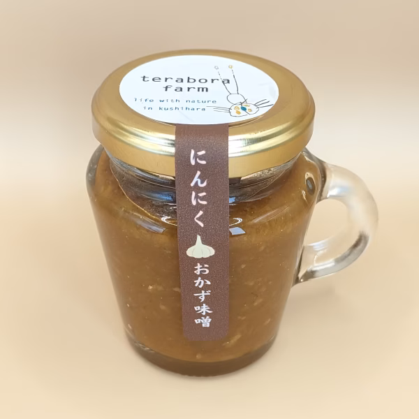 ■にんにくおかず味噌  約100g入り ご飯のおともに「にんにくおかず味噌」が大活躍します。 パンチの効いたにんにくの風味がお味噌の旨味とマッチして食べやすいおかず味噌に仕上がっています。 にんにく好きな方にはおすすめです。 ご飯に乗せても、パンに塗ってもおいしい! ■てらぼら農園のにんにく てらぼら農園のにんにくは、栽培期間中農薬や化学肥料を一切使用せずに丁寧に栽培しています。 そのにんにくをこだわりの素材を使用し、おいしいおかず味噌に仕上げました。 ■地元産の大豆でつくったお味噌を使用 地元で丁寧に栽培された大豆から手作りされたお味噌を使用しています。 また、昔ながらの蒸し製法で大豆の旨味と栄養をまるごと使い、麹は自家発酵させて手間暇かけて丁寧に作られているので、大豆の味そのものを感じられるお味噌となっています。 お塩はてらぼら農園が使用している天日塩を使用してもらい作ってもらっているオリジナルのお味噌になります。 ■こだわりの素材 その他の素材も添加物を一切使用せずにつくられたこだわりの調味料を使用しています。 ◆原糖(鹿児島産)  原糖は白砂糖に精製される前の段階の砂糖で、精製時に失われてしまうカルシウムやナトリウムなどのミネラル分がそのまま含まれている砂糖です。 ◆純正胡麻油  純正胡麻油は、昔ながらの圧搾製法で、胡麻を強く焙煎することで、一般的な胡麻油よりも色・香りともに強く引き出しています。焙煎胡麻油独特の力強いコクと香りを引きだしています。 ◆料理酒  人や環境に配慮されて栽培されたお米を昔ながらの製法でお酒にしているainomamaブランドの料理酒。 ◆純りんご酢 青森県産のりんご果汁で作られたお酢。 ■おすすめの食べ方 炊き立ての白ご飯にちょこんと乗せて一緒にお召し上がりください。 にんにくとお味噌の旨味があふれ、ご飯が進みます。 また、きゅうりなどのお野菜をスティック状に切り、ディップのようにおかず味噌をつけて食べてもおいしいです。 マヨネーズと混ぜて簡単ドレッシングもおすすめです。 他にも、ラーメンに入れたり、唐揚げの下味に使用したり、炒めものの味付けにも使える万能おかず味噌です。 にんにくの風味が強いと感じた方は火を通す料理に使用することによって、まろやかになりますので、にんにくが苦手な子どもさんでも食べられるようになります。 ◆原材料 にんにく(岐阜県恵那市産)、味噌(岐阜県恵那市産)、原糖(鹿児島産)、ごま油、料理酒、りんご酢 ◆内容量 約100g ◆保存方法 直射日光を避け常温で保存。開封後は冷蔵で保存し、お早めにお召し上がりください。 ◆栄養成分表(100gあたり 推定値) エネルギー219kcal、炭水化物21.1g、脂質12.7g、タンパク質4.6g、食塩相当量3.4g