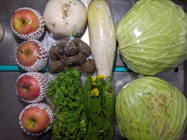 キャベツ4kg、ダイコン1.2kg、カブ1kg、サトイモ500g、アスパラ菜250g、わさび菜100g、リンゴ1.3kgの詰め合わせです。リンゴはふじです。