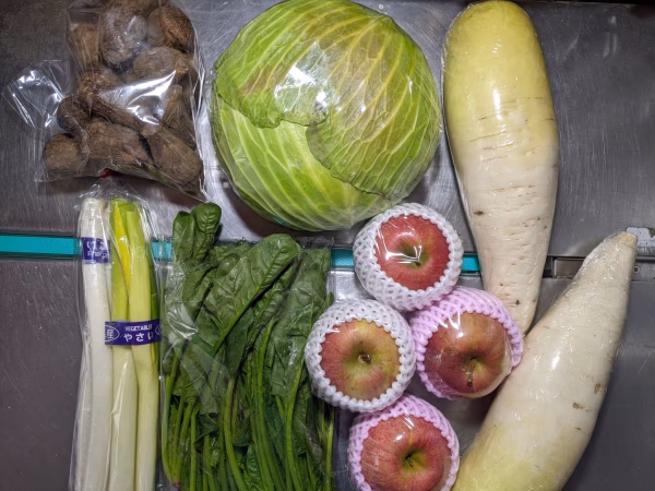 キャベツ1.4kg、ダイコン2.4kg、サトイモ800g、ネギ300g、ホウレンソウ200g、リンゴ900gの詰め合わせです。リンゴの品種はふじです。
