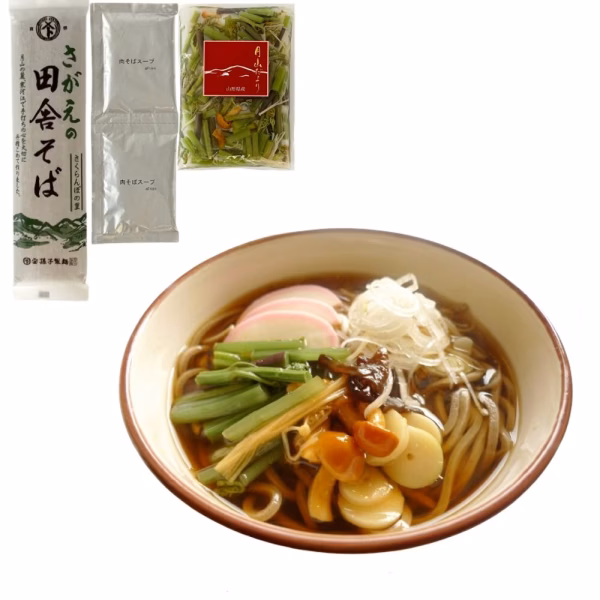 喉ごしの良い田舎そば(乾麺)と特製スープに山菜ミックス水煮をセットにしました