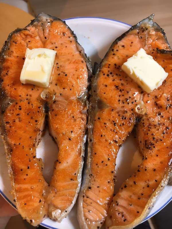 ・サーモン輪切り2切れ(解凍後塩胡椒を少々)