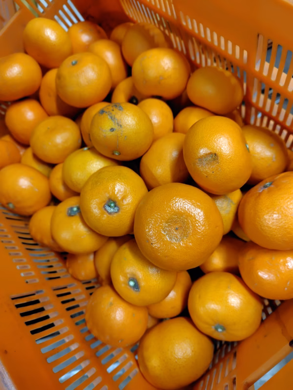 そのせとかの中で、水やけ・クラッキングなどの果皮障害、裂傷・トゲ刺し等の腐りに繋がりやすい生キズがあるものを「加工用」として、大小混ざりますが5kg箱に詰めたいと思います