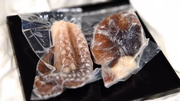 底建て網で捕れたタコを捕れたて新鮮なうちに浜茹でし、真空パックをして急速冷凍しています。