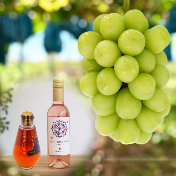 この商品は、花笑み農園で人気がある、シャインマスカットとピオーネワインと飲む酢のセットです。シャインマスカット1房とピオーネワイン1本と飲む酢ピオーネ1本入りでお届けいたします。