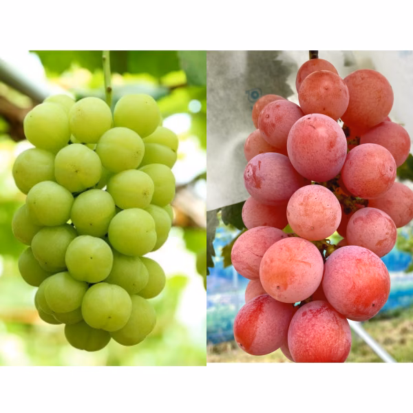 数量限定!!粒がぷりっとハート型のような瀬戸ジャイアンツと高糖度でピンクの粒のクインニーナのセットです。瀬戸ジャイアンは房が少し小さめなので2房ご用意してお届けします。 9月お届け予定 瀬戸ジャイアンツ:糖度は高く、ぱりっとした食感を楽しめる品種。通称「ももたろうぶどう」と呼ばれ、粒がぷりっとおしりのようなハートのような形が特徴。皮がとても薄く繊細なため、少し傷ができることもありますが、品質や味に支障はございません。 クインニーナ:果肉がしっかりとしているのでとっても食べ応えがあり、甘みがとても強いぶどうです。 ワインのような芳醇な香りは上品で、色味もピンクに近い赤色で、贈り物にもぴったりです。 ※当園では、できるだけ農薬の散布を減らしてるため、 ぶどうの粒に傷や汚れがある場合がございます。 品質上問題はありませんので、ご安心してお召がりください。 ※種無しで育てておりますが、稀に種が入ることがございます。 ※写真はイメージです。 <栽培のこだわり> ひとつひとつ丁寧に手作業で育てております。安心して食べていただけるように、高畝で育て、農薬の散布する回数を減らし水の管理もできるように育てています。 <産地の特徴> 泉州地域は比較的温暖な気候で、太陽をたくさん浴びることができる平地で育てています。周りは畑なので日差しを遮ることなく、ぶどうに太陽を届けられ、甘く粒も大きく育ってくれます 品種▽ クインニーナ、瀬戸ジャイアンツ