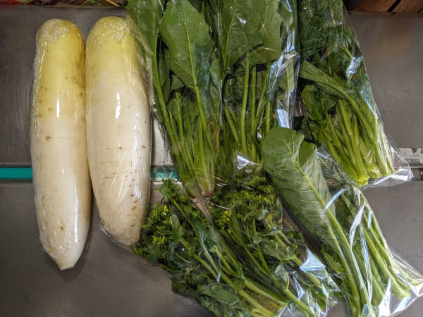 ダイコン2.8kg、ホウレンソウ400g、茎立ち500g、アスパラ菜400gの詰め合わせです。