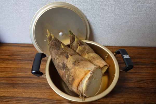 お鍋いっぱいの水にたけのこを皮ごと入れて強火にかけます