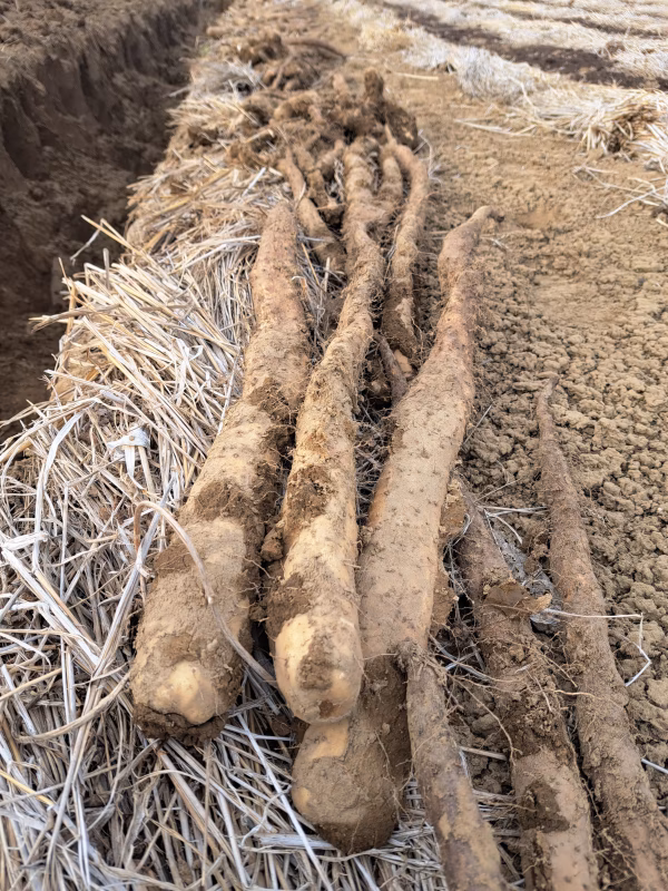 砂壌土の畑ではなく、腐植の富んだ粘質土壌を選び、ボカシ肥料で栽培しているため、独特の甘みがおいしく、粘りの強い芋です。
