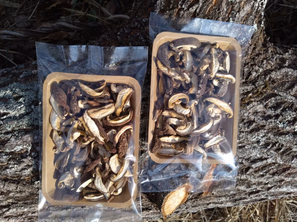 蔓延させ自然の林などの日陰を利用したところに立て掛け並べて行き ます。1年のうち秋と春の短い間、温度の低下と降雨により発生するので乾燥して保存し水に戻して使用します。