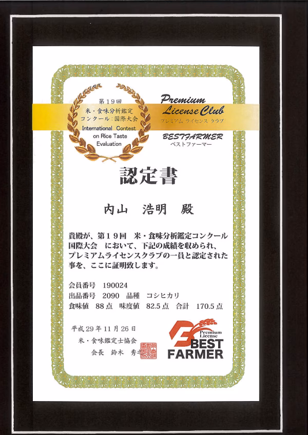 【第19回 米・食味分析鑑定コンクールにおいて、弊社のお米が総合得点170点を超え、ベストファーマー認定を受けることになりました!】