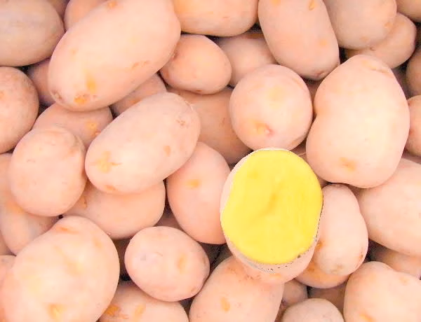 大きさは小ぶりで卵形をしており、収量が少なく、生産量は限られており幻のじゃがいもともいわれています。糖度が6〜8度と高く、甘く濃厚な味わいでナッツや栗に似た独特の風味があります。肉質はやや粘質できめが細かく、舌ざわりがとても良いです。